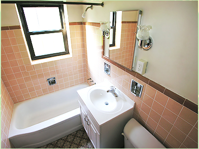 Our new bathroom... Even though the pink/brown tiles aren't my favorite, having new white fixtures is a HUGE improvement from what we have now- maroon tub, toilet and sink, impossible to keep clean! I don't have any big ideas for this room yet, what do you guys think? Any color schemes come to mind?
