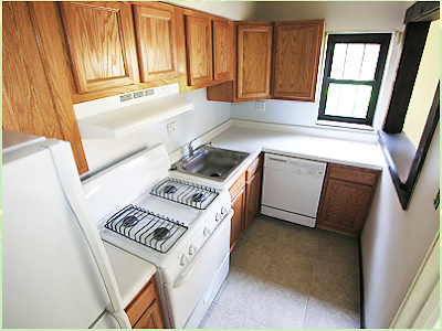 Brand new white appliances!!! Cabinets that are not made of metal and from the 1950's!!! (Although I admit, I do think our old apartments cabinets were pretty charming, there just wasn't nearly enough of them!) Look at that counterspace!! And that's right! The thing you see under the window is indeed a DISHWASHER!!!