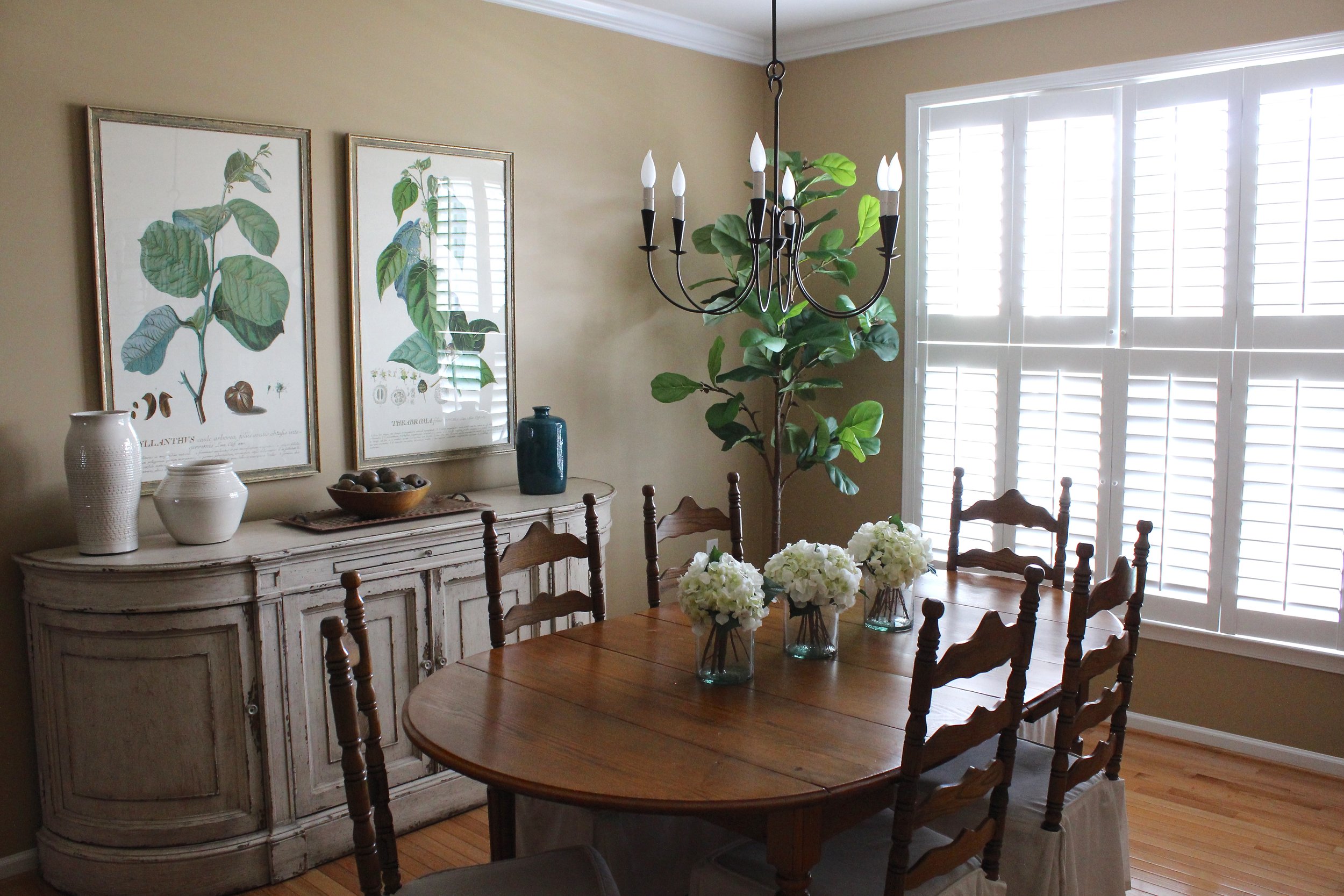 The styling in this room is actually fairly minimal. My main goal was to balance the scale of the large buffet and front window with some hefty art work that would be the main statement of the room. I am so in love with this pair of vintage bookplate prints from Ballard Designs. The colors are even more striking in person. A few pieces of pottery in complementary colors and a fiddle leaf fig (which we placed in an antique crock) were all we needed to round out the room design. The finished look is fresh, and just full enough to look put together while still leaving plenty of breathing space for entertaining.